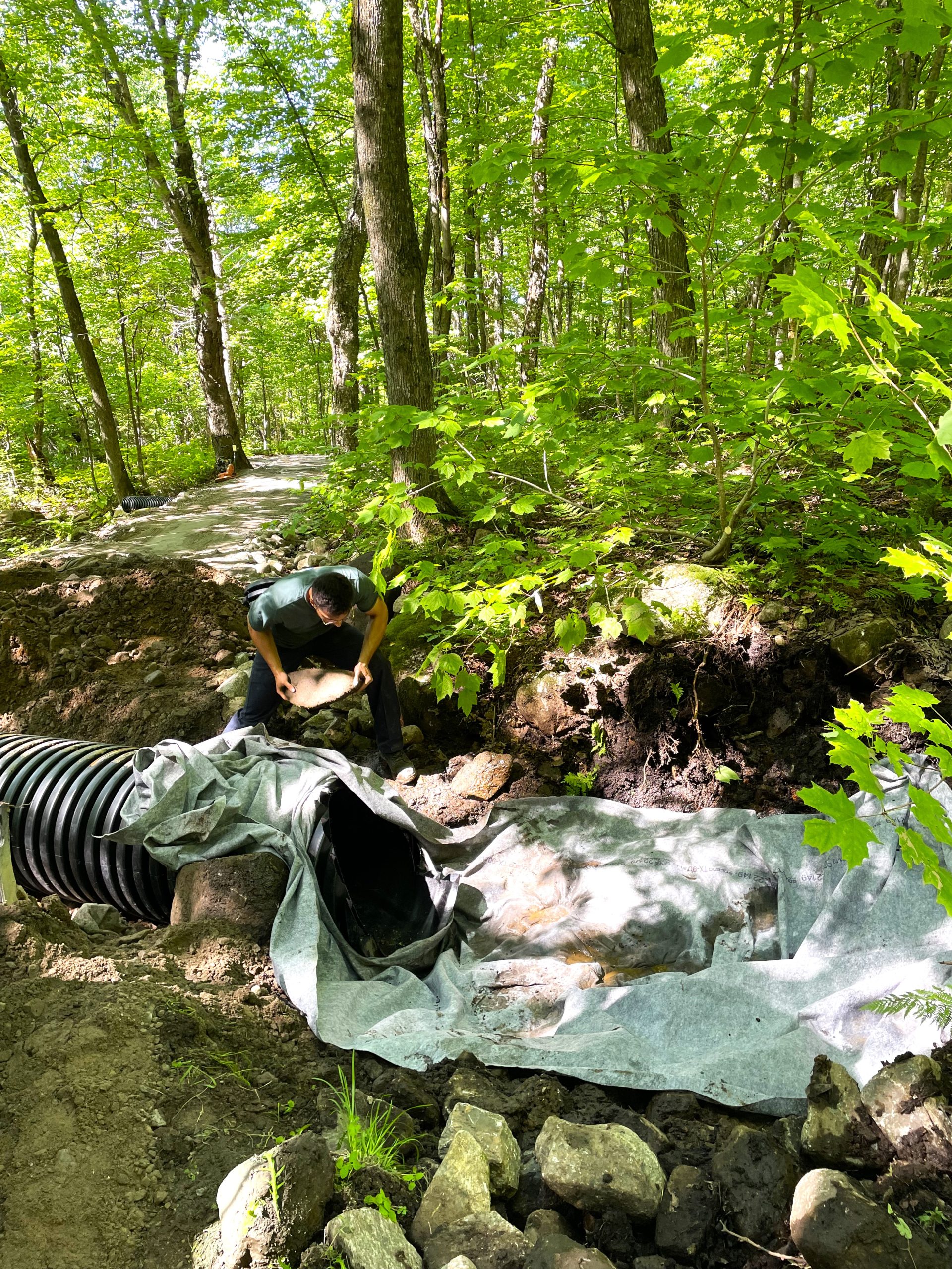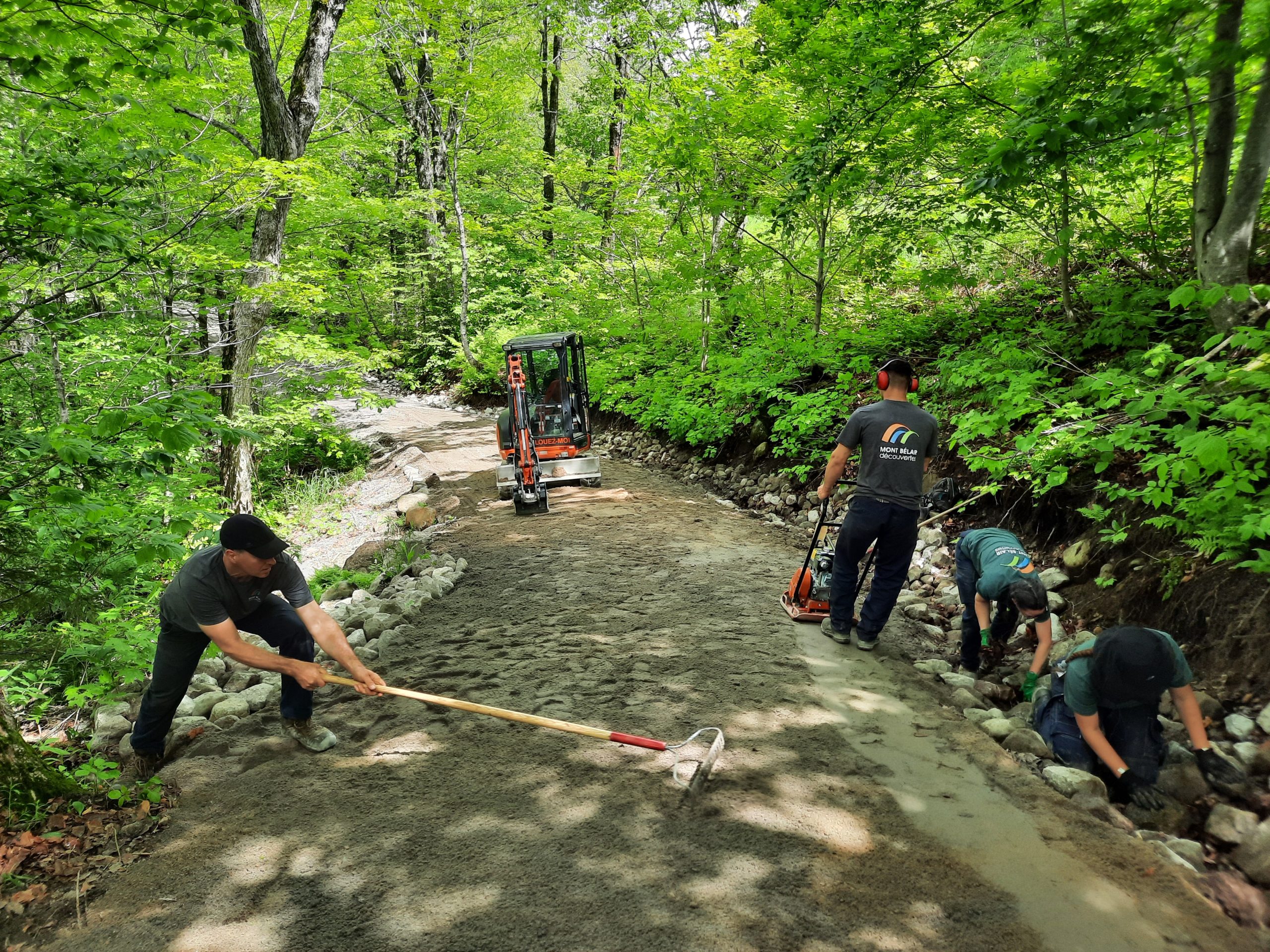 Du 14 juin au 13 juillet 2022, MBD a entrepris des travaux de réfection des sentiers de marche dans le secteur du sommet pour améliorer le drainage et éviter la dégradation des pentes lors des épisodes de fortes pluies. En un mois, l’équipe a installé 16 ponceaux de 8 à 24 pouces de diamètre et utilisé plus de 150 tonnes d’agrégats pour resurfaçer 1000 mètres de sentiers.